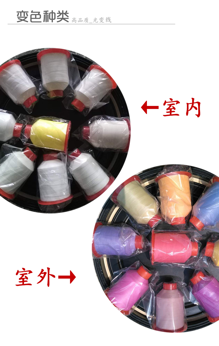 光變線是由進口(kǒu)光變材料在纖維成型時添加進去(qù),或者單體塗層(céng)的形式做出的產品,產品一般是在紫外燈(dēng)光下、陽光下變成另外一種顏色。室內一般都顯示的是本色,陽光下會變色為另外一種顏色,目(mù)前我們有庫存7種(zhǒng)顏(yán)色,也可以定做不同的顏色,光變線一般是(shì)采用70D以上的滌綸或錦綸用兩股、三股股線和單紗(shā)都進行倍撚,該(gāi)產品無毒環保,耐水洗。
