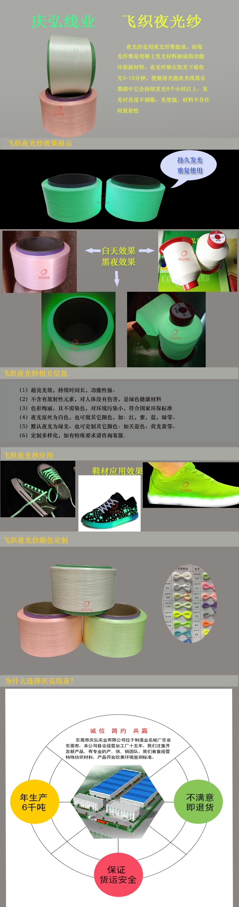 夜(yè)光線是用夜光纖(xiān)維撚成,而(ér)夜光纖(xiān)維是用稀士發光材料製成的功(gōng)能環保(bǎo)新材料。夜光(guāng)纖維在陽光下吸(xī)收光5-10分鍾,便能將光(guāng)能夜光線放在黑暗中(zhōng)它會持續(xù)發光4-6個小(xiǎo)時以上。發光時亮度不刺(cì)眼、光效強,材料不含任何(hé)放射性。