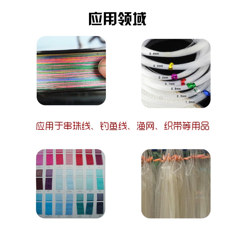 漁絲(sī)線 主(zhǔ)要原料:尼龍切片(piàn)、聚酯切片、PA切片、PET切片、滌綸切片。
