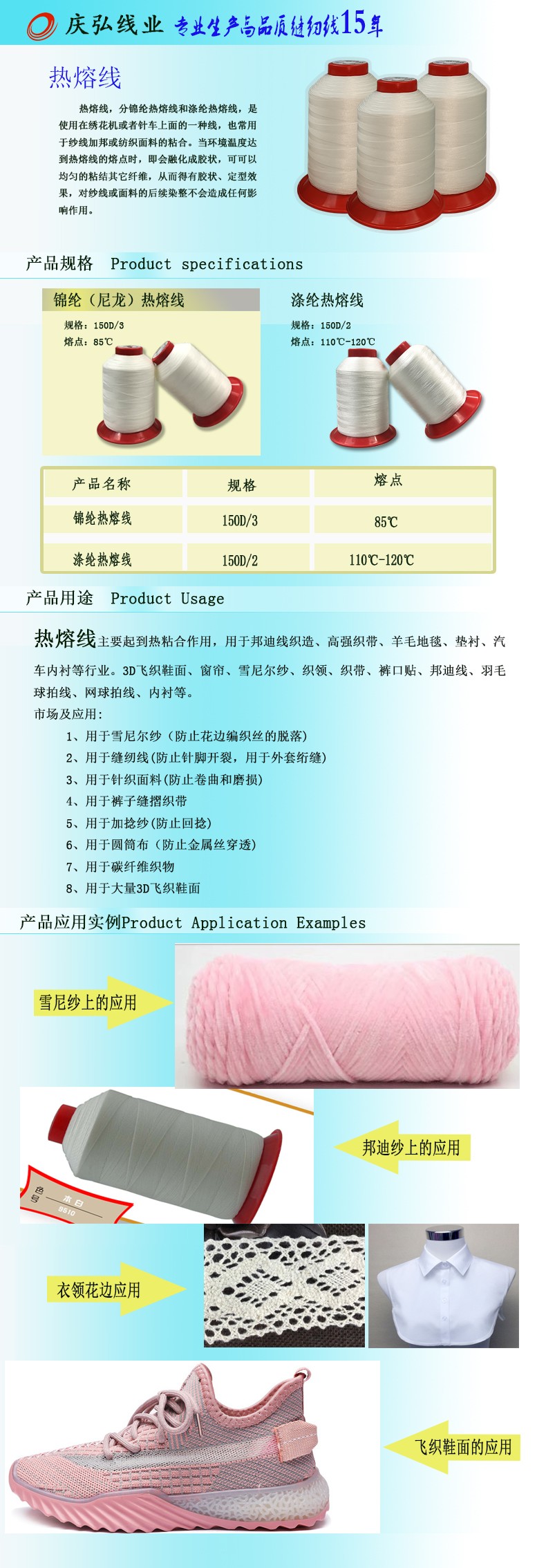 熱熔線主要起到熱粘合作用,用於邦迪(dí)線織造(zào)、高強織帶、羊毛地毯、墊襯、汽